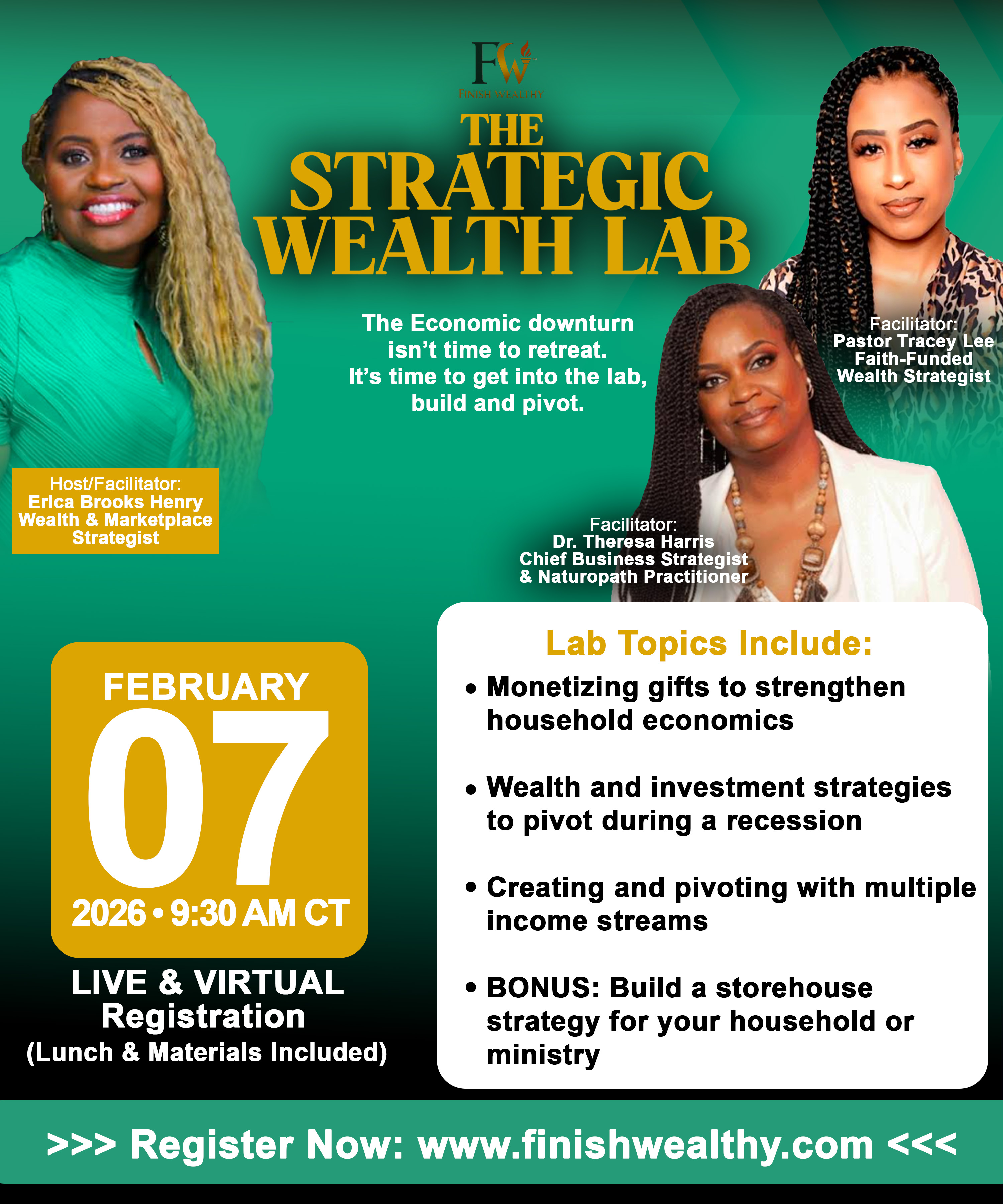 Join Erica Brooks Henry, Wealth & Marketplace Strategist, and Pastor Tracy Lee, Faith-Funded Wealth Strategists, for a power-packed wealth experience that teaches you how to:
